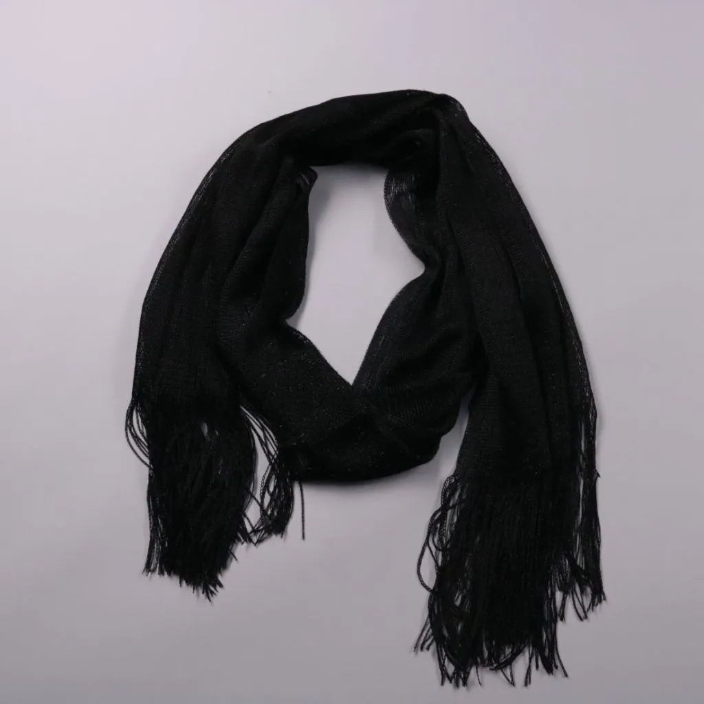 Чёрный шарф без бренда с лёгкой фактурой и бахромой по краям. Подойдёт для повседневных образов и в офис, чтобы утеплиться в прохладную погоду. Удобно завязывается и легко сочетается с верхней одеждой разных цветов.