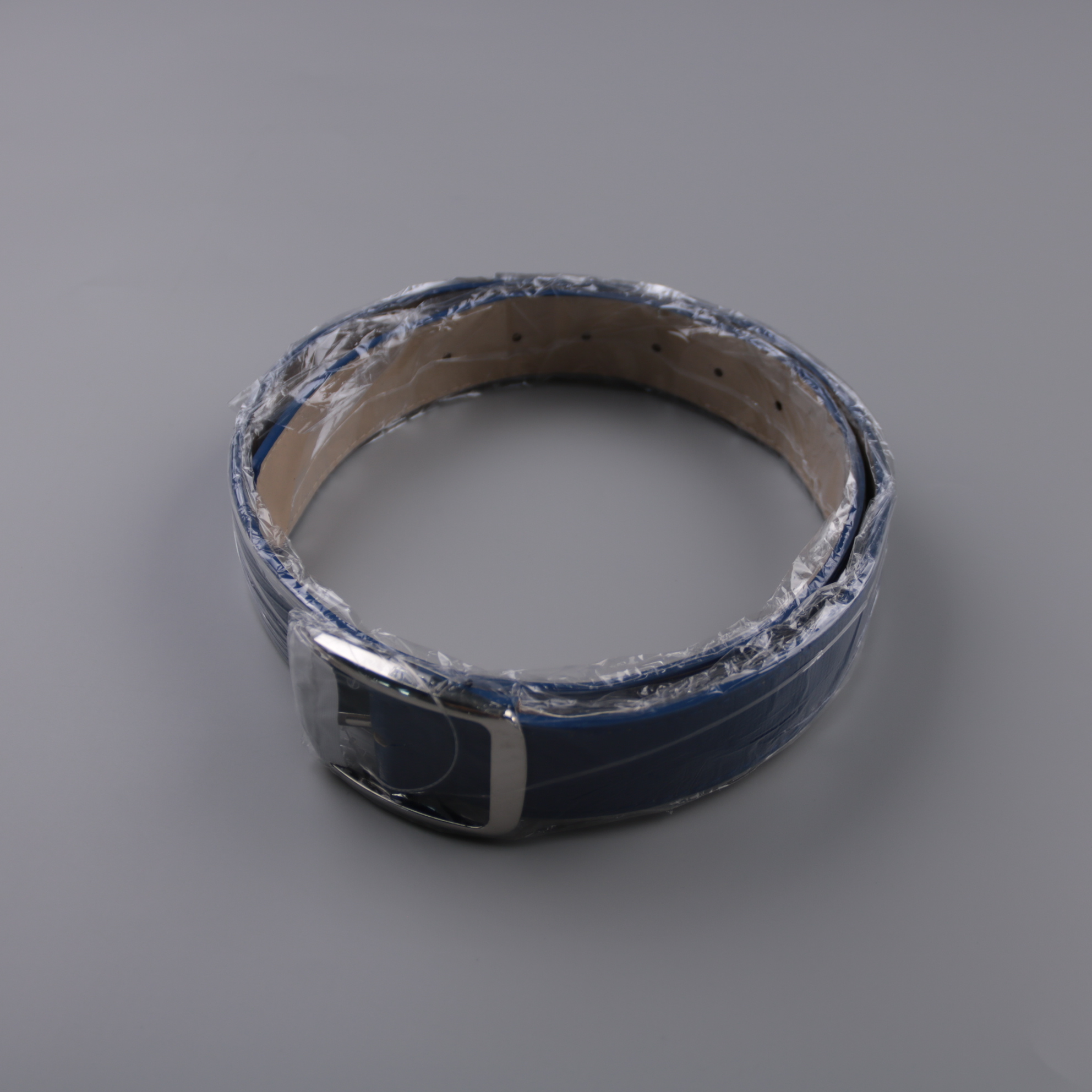 Синий ремень из гладкого материала с металлической пряжкой. Подойдёт для джинсов и брюк в повседневных образах, легко сочетается с базовой одеждой. Прочная пряжка хорошо держит фиксацию и не требует сложного ухода.
