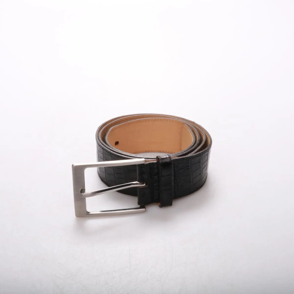 Ремень из кожи с тиснением под крокодила, чёрного цвета, с прямоугольной металлической пряжкой. Подойдёт к классическим брюкам и джинсам, а также для повседневных образов. Прочный материал хорошо держит форму и аккуратно фиксируется на талии.