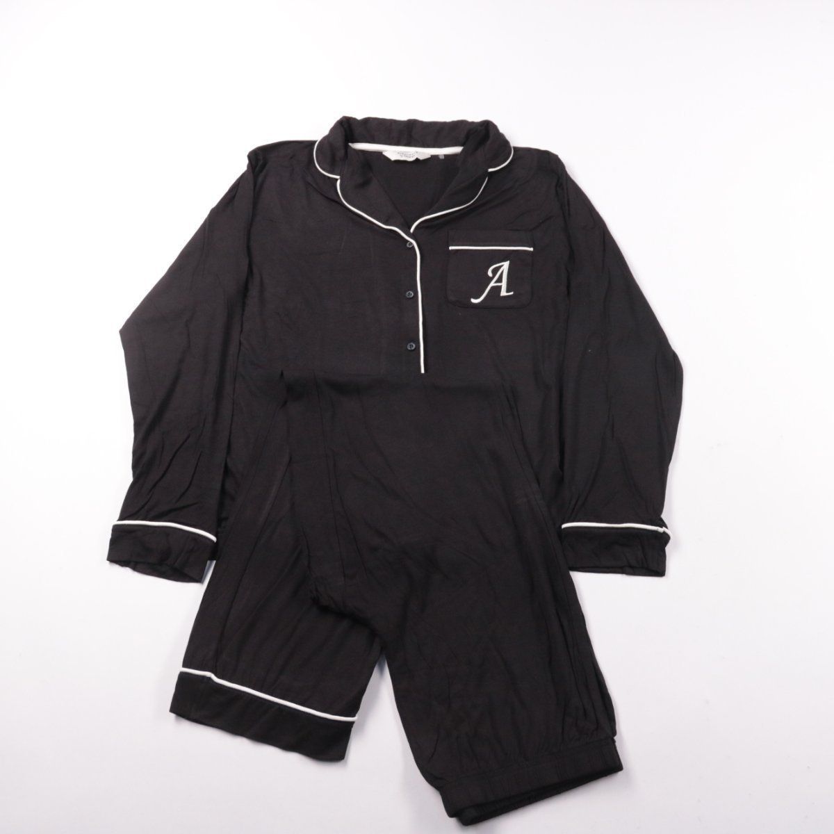 Чёрная пижама George состоит из лонгслива с длинным рукавом и укороченных брюк, отделанных белым кантом. Подойдёт для сна и домашнего отдыха в любое время года. Ткань с добавлением эластана немного тянется и удобна в носке.