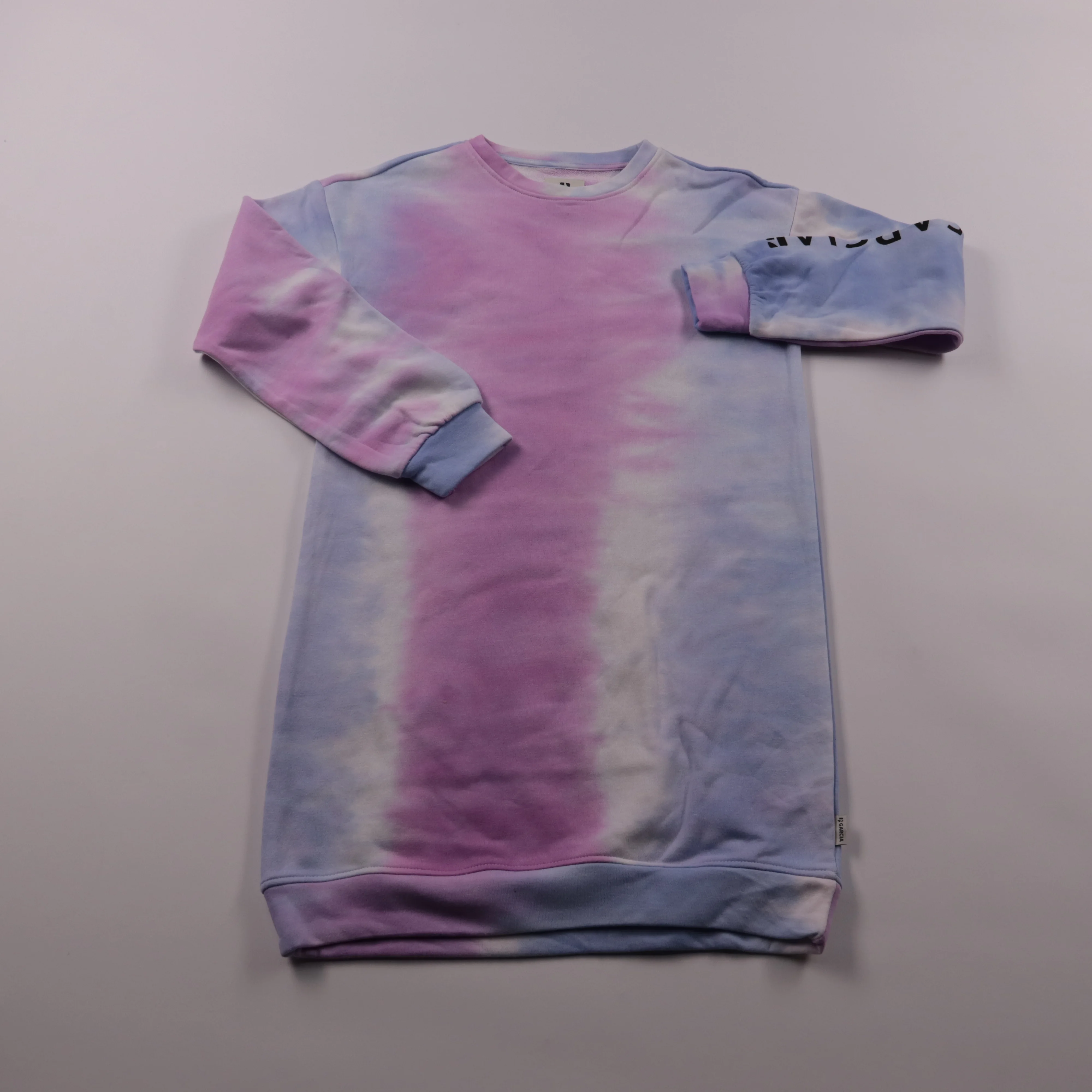 Платье-свитшот Garcia в стиле тай-дай в розово-голубых тонах, с длинным рукавом и мягкими манжетами. Подойдёт для школы, прогулок и повседневной носки в прохладную погоду. Трикотаж с высоким содержанием хлопка приятен к телу и прост в уходе.