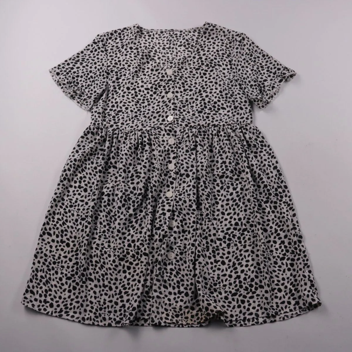 Платье Shein для девочки с коротким рукавом и застёжкой на пуговицы спереди, выполнено в бело-чёрном пятнистом принте. Подойдёт для прогулок и повседневной носки в тёплую погоду. Пуговицы по всей длине помогают быстро переодевать ребёнка.