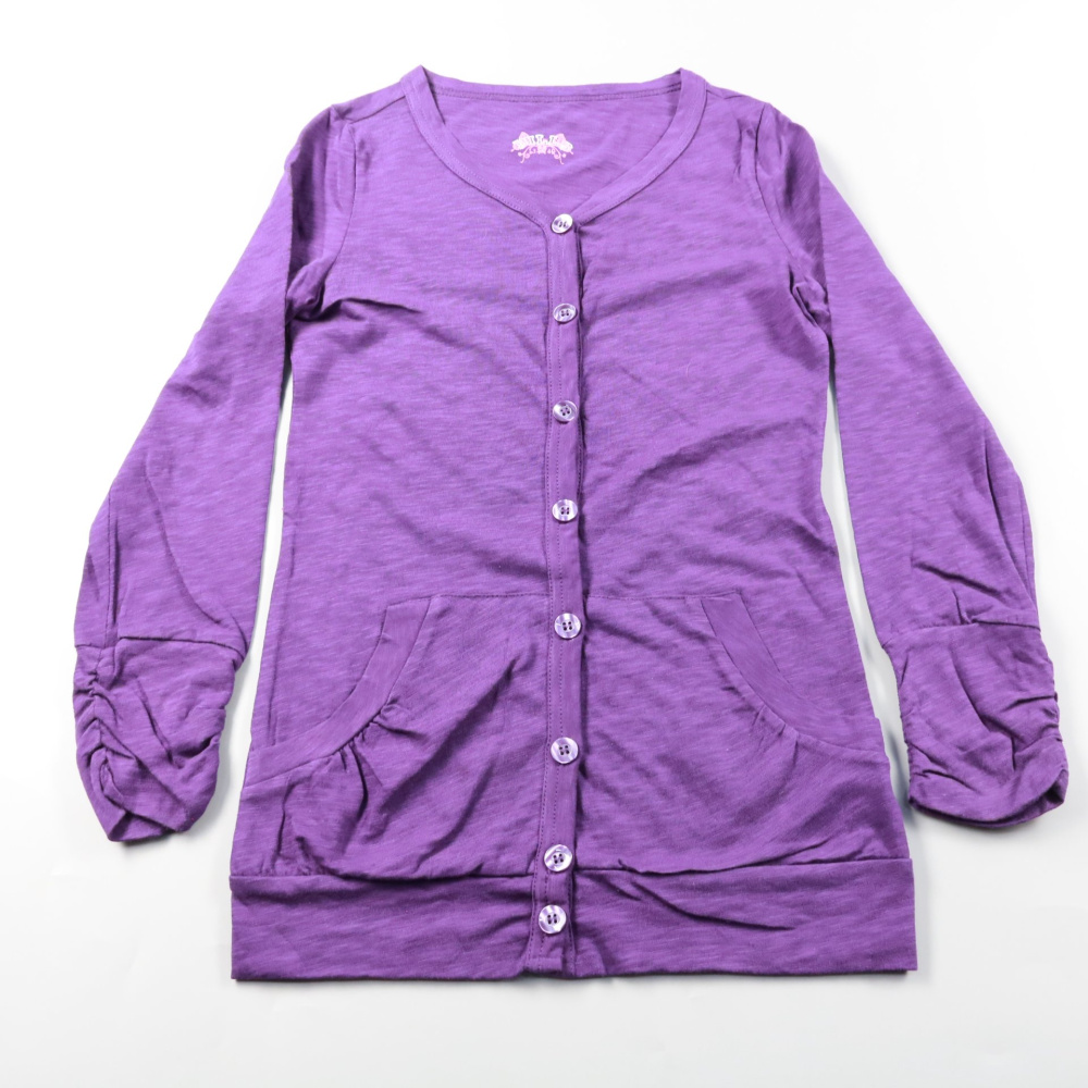 Хлопковая кофта TCM на пуговицах, фиолетового цвета, с двумя накладными карманами и сборками на рукавах. Подойдёт для школы и прогулок в прохладную погоду, удобно носить поверх футболки или водолазки. Натуральный хлопок приятен к телу и хорошо дышит.