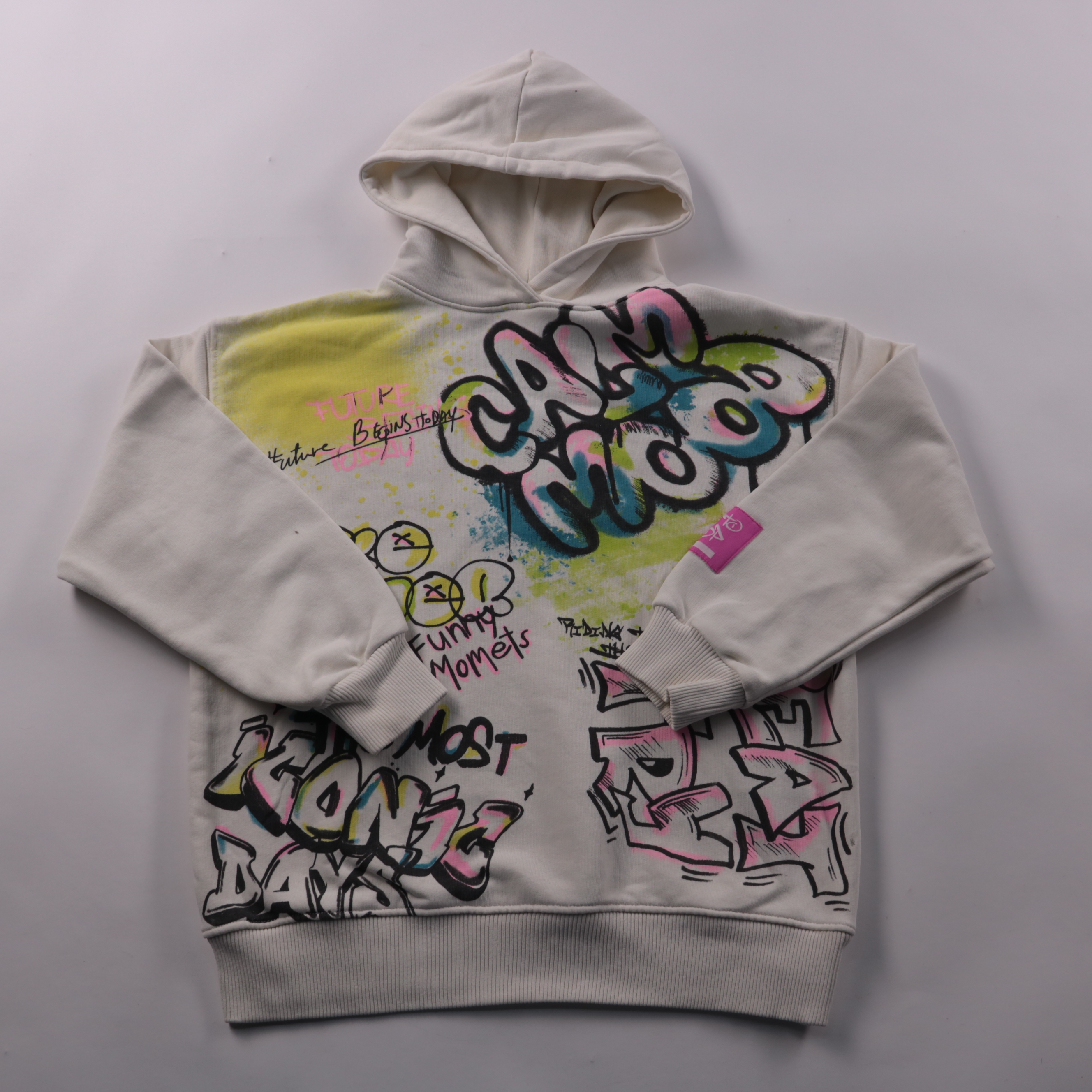 Худи Zara для мальчика молочного цвета с ярким принтом в стиле граффити и капюшоном. Подойдёт для школы и прогулок в прохладную погоду, удобно носить с джинсами или спортивными брюками. Мягкая ткань и манжеты на рукавах помогают сохранять тепло и комфорт.