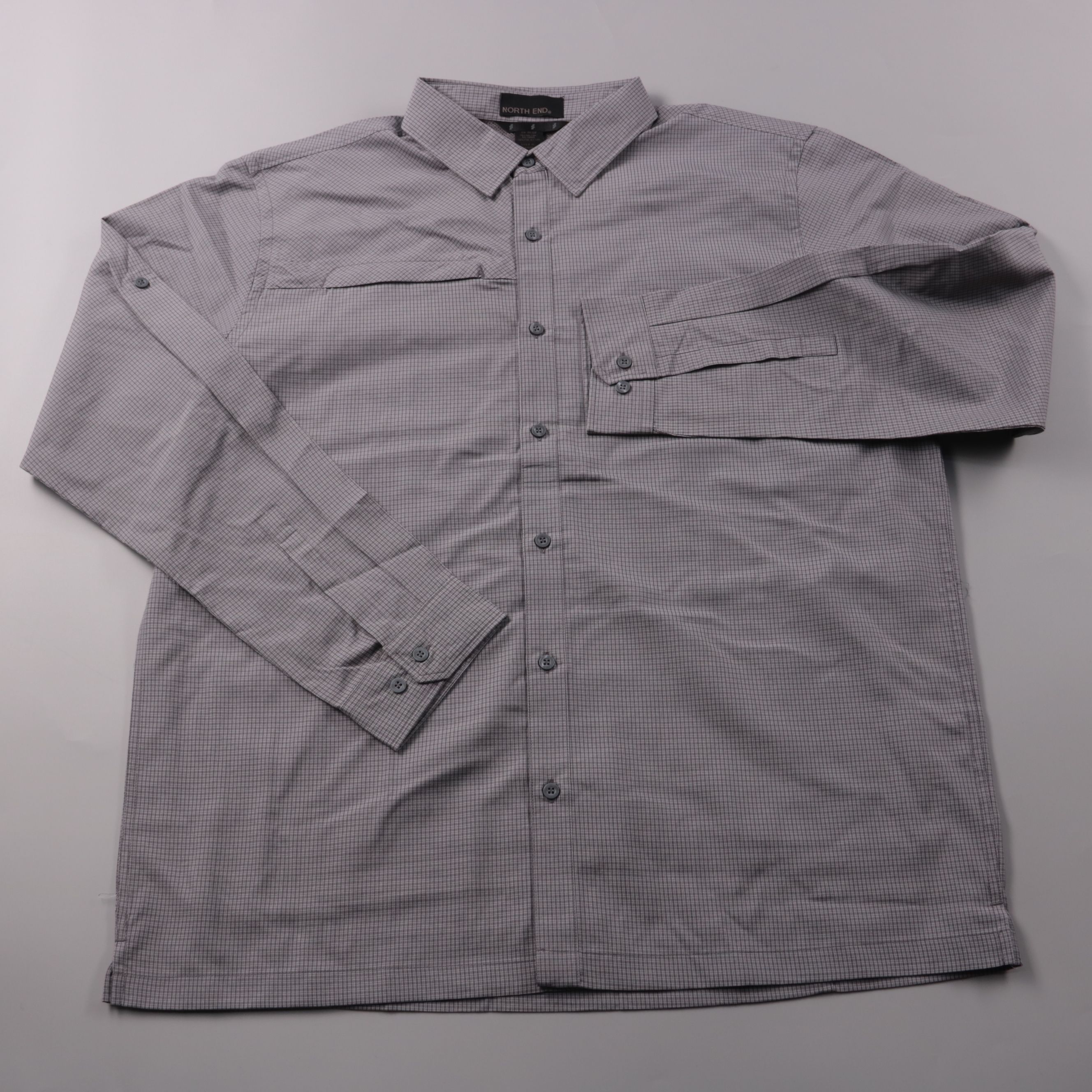 Мужская рубашка North End с длинным рукавом и застёжкой на пуговицы, в мелкую клетку серого цвета. Подойдёт для офиса и повседневных образов в прохладную или умеренную погоду. Смесовая ткань (вискоза/полиэстер) легче в уходе и быстрее сохнет.