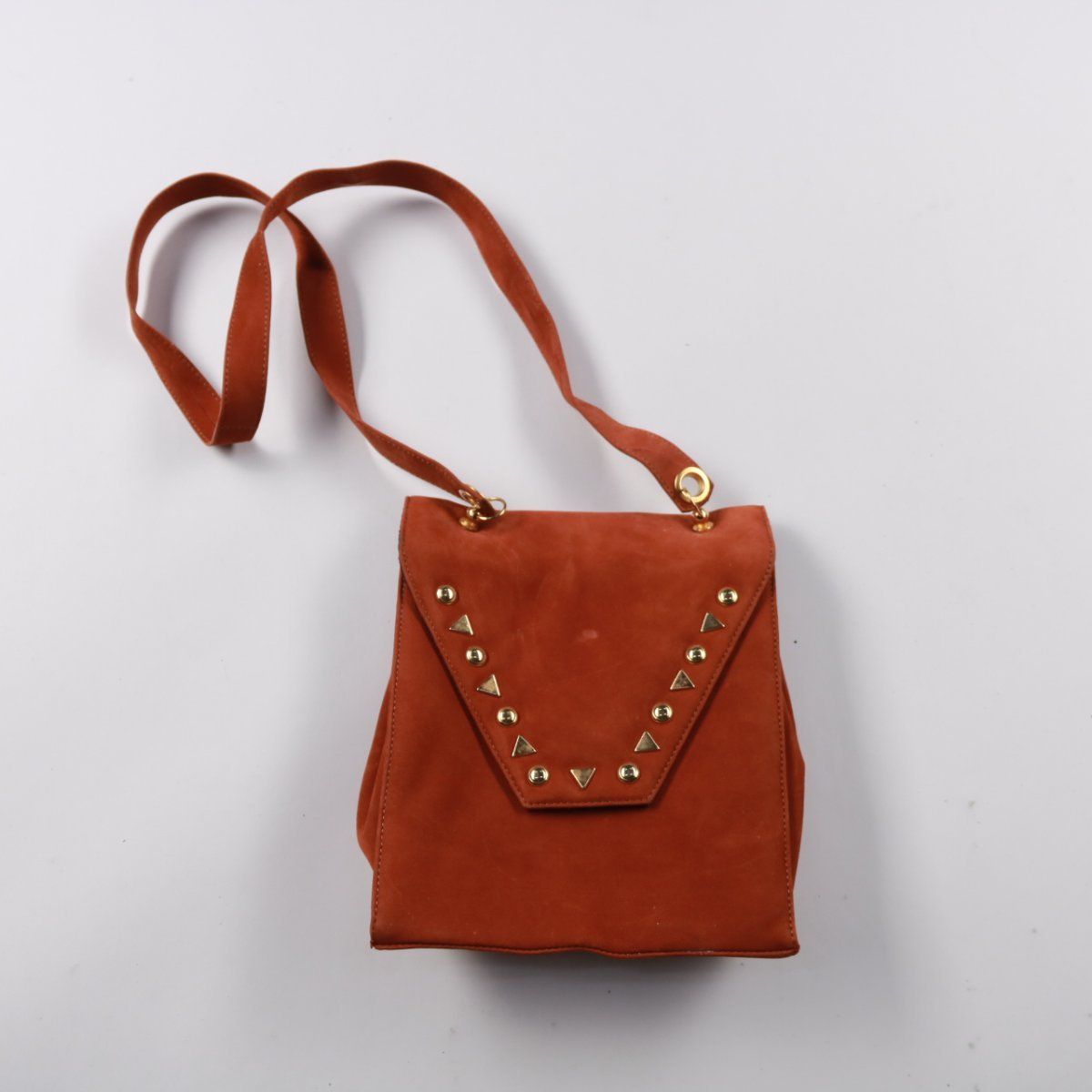 Женская сумка через плечо из материала под замшу, терракотового цвета, с клапаном на магнитной кнопке и декоративными заклёпками. Подойдёт для повседневных прогулок и городских выходов, когда нужно взять с собой самое необходимое. Длинный ремешок освобождает руки и удобно регулируется по посадке.