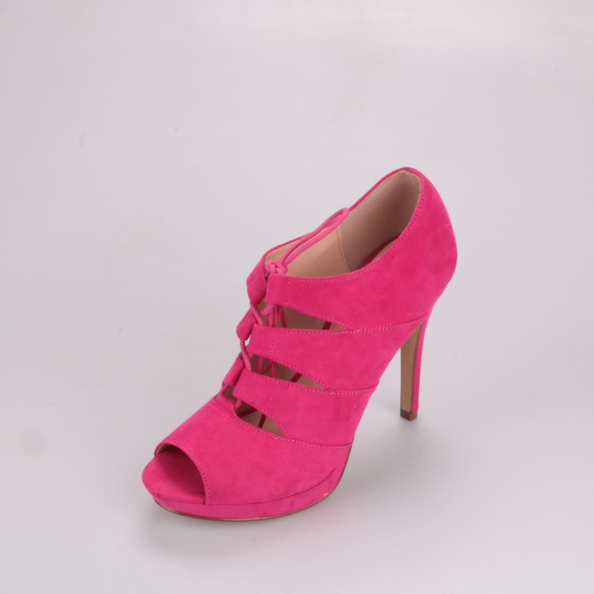 Босоножки Catwalk ярко-розового цвета из материала под замшу, на тонком высоком каблуке и с открытым носком. Подойдут для вечерних выходов и летних мероприятий, шнуровка хорошо фиксирует стопу и помогает подогнать посадку.