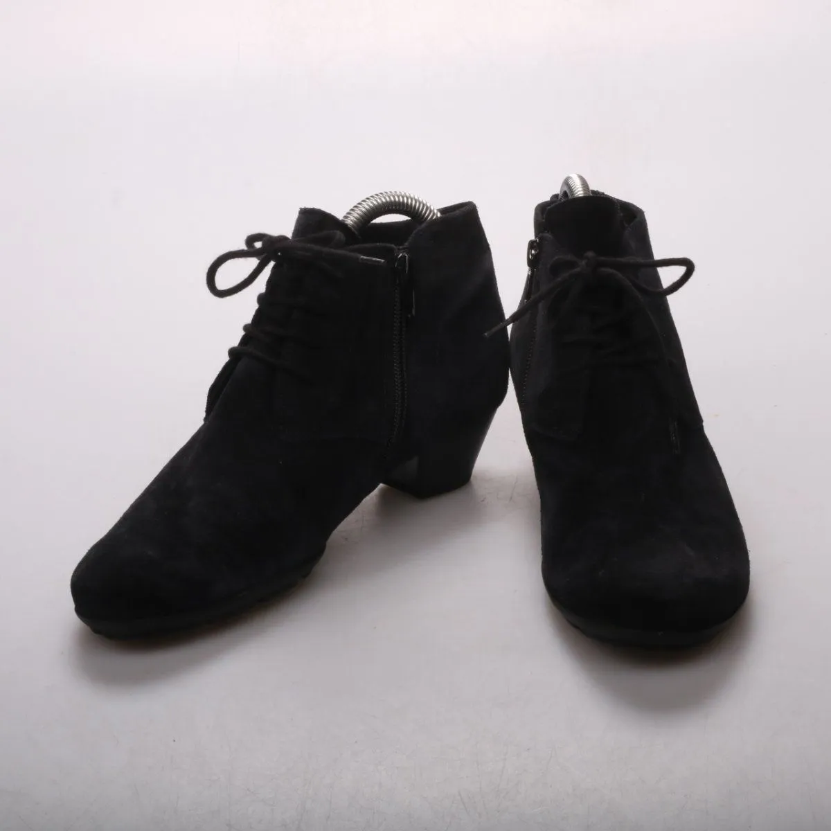 Женские ботильоны Gabor из чёрной замши со шнуровкой и боковой молнией. Подойдут для повседневных образов в прохладную погоду весной и осенью. Устойчивый каблук и рельефная подошва делают их удобными при ходьбе.