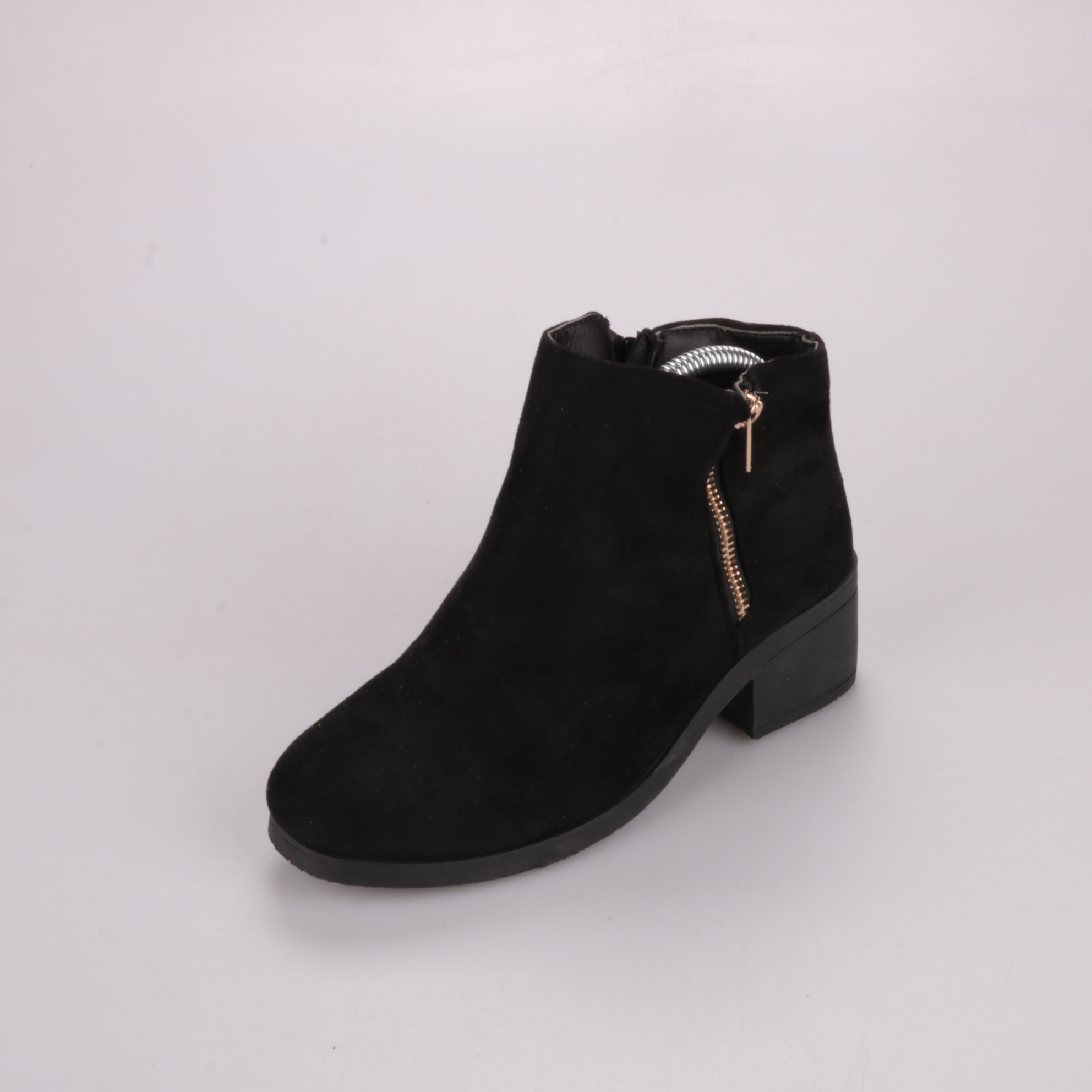 Черные ботильоны из мягкого материала под замшу с удобной боковой молнией. Подойдут для повседневных образов в межсезонье, хорошо сочетаются с джинсами и платьями. Устойчивый невысокий каблук делает пару комфортной для длительной ходьбы.