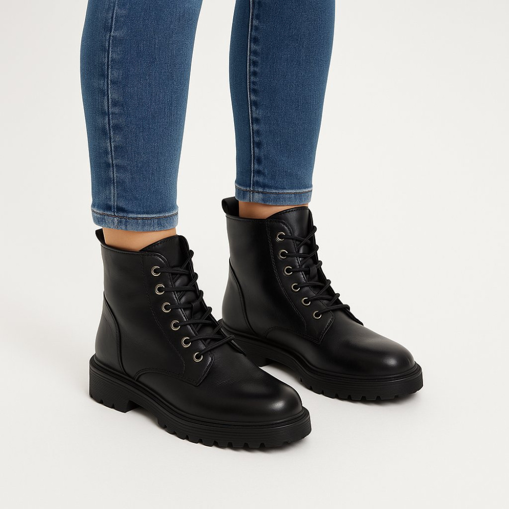 Женские черные ботинки на шнуровке с боковой молнией и массивной тракторной подошвой. Подойдут на каждый день в прохладную погоду, хорошо сочетаются с джинсами и юбками. Рельефная подошва дает устойчивость и лучшее сцепление на мокрой дороге.
