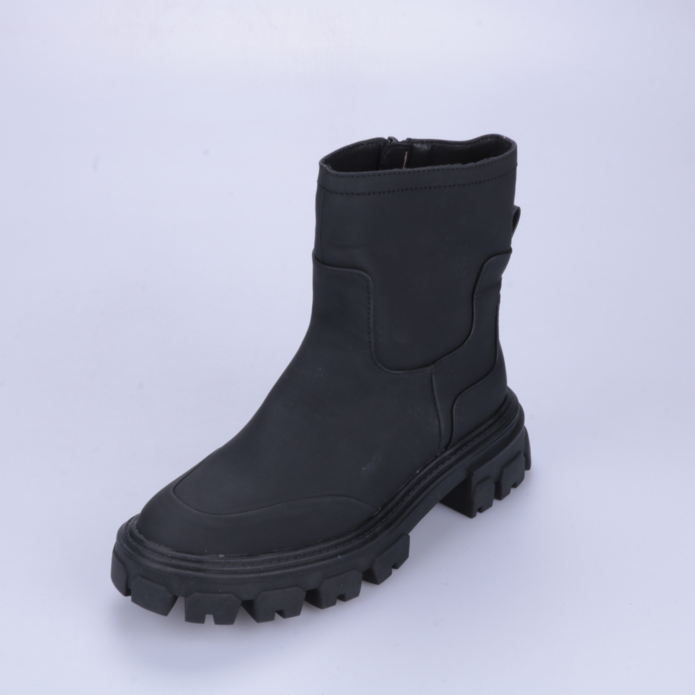 Чёрные женские ботинки на массивной тракторной подошве с боковой молнией. Подойдут для повседневных образов в прохладную погоду и прогулок по городу. Рельефный протектор даёт хорошее сцепление и устойчивость на мокром асфальте.