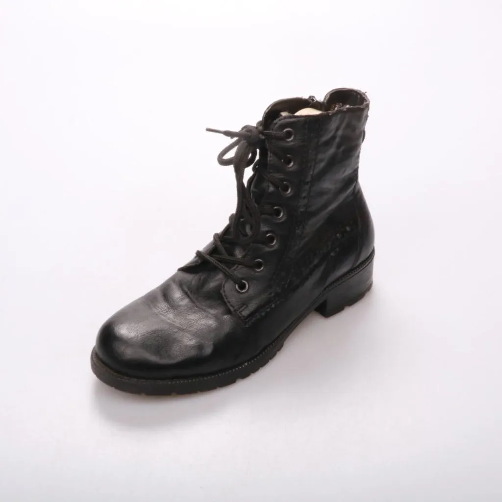 Женские ботинки Rieker на шнуровке, выполнены в классическом чёрном цвете. Подойдут для повседневной носки в городе в прохладную погоду и межсезонье. Практичное преимущество — устойчивая подошва с выраженным протектором.