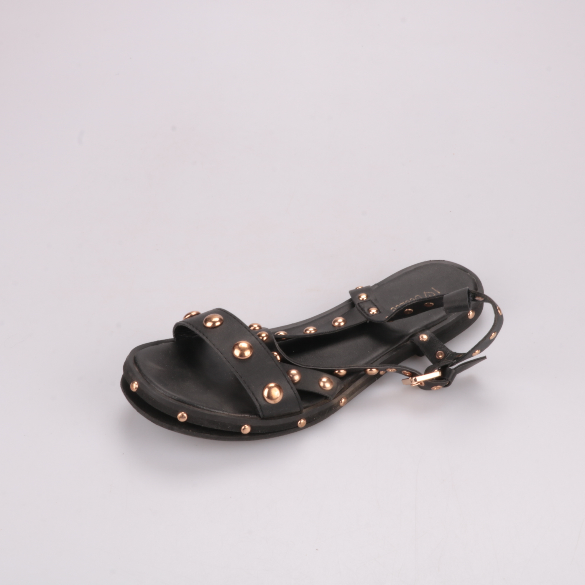 Женские сандалии DeeZee из чёрной экокожи с декором из металлических заклёпок и ремешком на пряжке. Подойдут для летних прогулок и повседневных образов с платьями, шортами или джинсами. Удобная плоская подошва и регулируемая застёжка помогают комфортно...