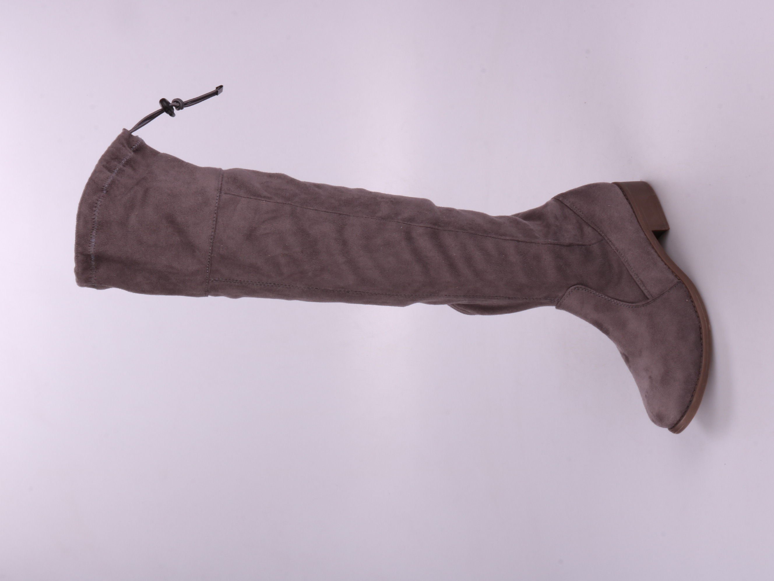 Высокие сапоги без бренда из искусственной замши в серо-коричневом цвете, с боковой молнией и шнурком-утяжкой сверху. Подойдут для прохладной осени и тёплой зимы, хорошо смотрятся с платьями и узкими джинсами. Устойчивый невысокий каблук удобен для ход...