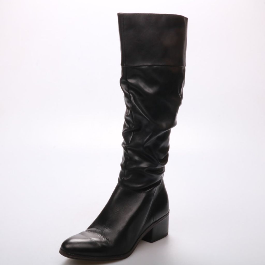 Женские чёрные сапоги без указания бренда, с мягким присборенным голенищем и боковой молнией. Подойдут на каждый день в прохладную погоду и к платьям или джинсам. Устойчивый каблук делает их удобными для длительной ходьбы.