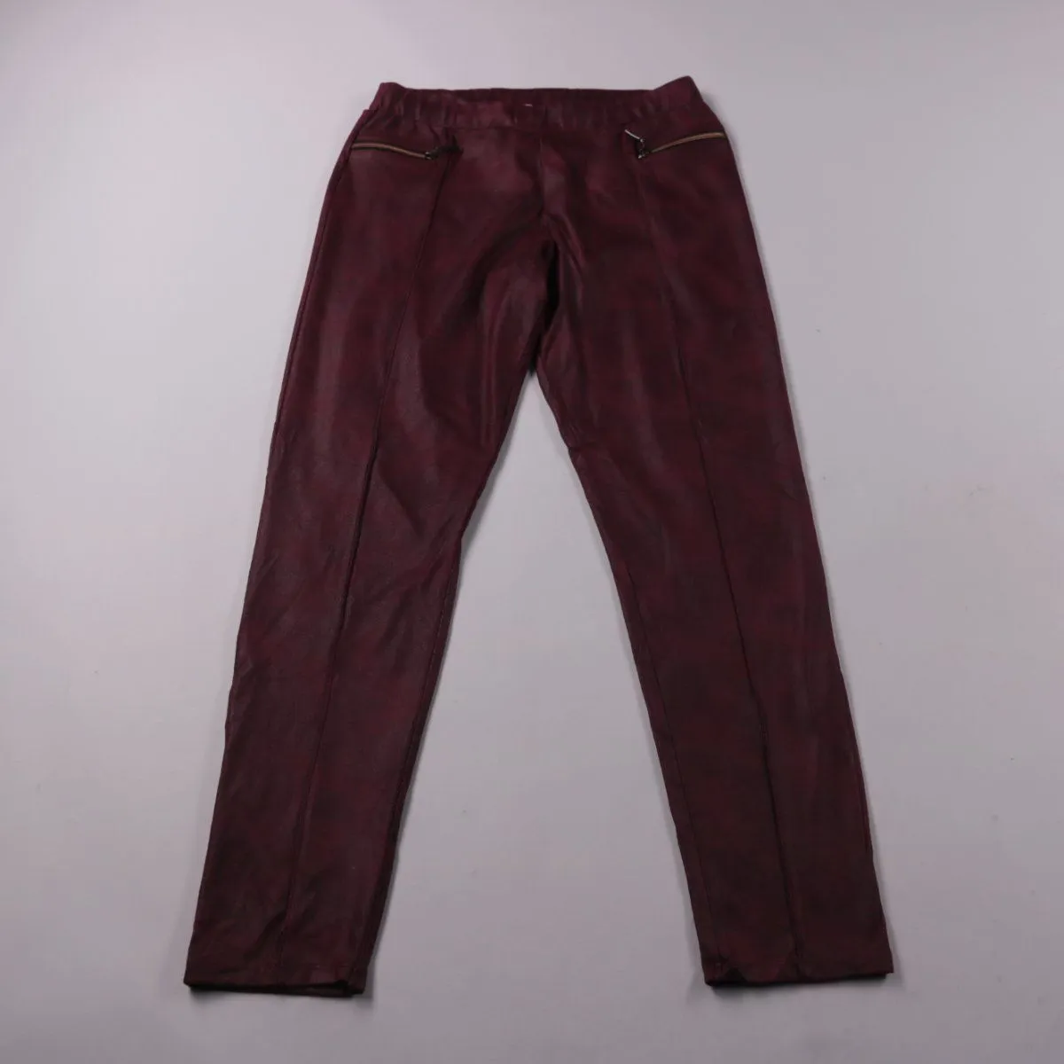 Женские брюки Kalisson в бордовом цвете с эффектом кожи и молниями на карманах. Подойдут для повседневных образов в прохладную погоду и на выход. Тянущийся материал комфортно садится по фигуре и не сковывает движения.