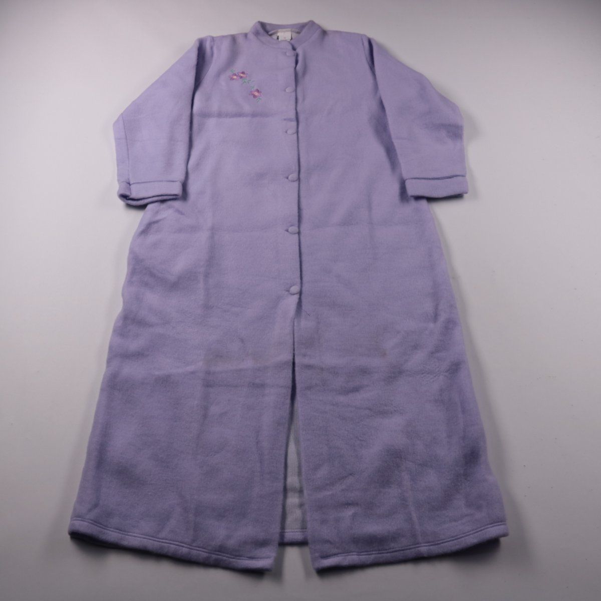 Домашний халат Courtelle лавандового цвета на пуговицах, с небольшим вышитым цветочным мотивом на груди. Подойдёт для дома и в качестве тёплой накидки после душа в прохладные дни. Мягкий акриловый материал неприхотлив в уходе и быстро сохнет.