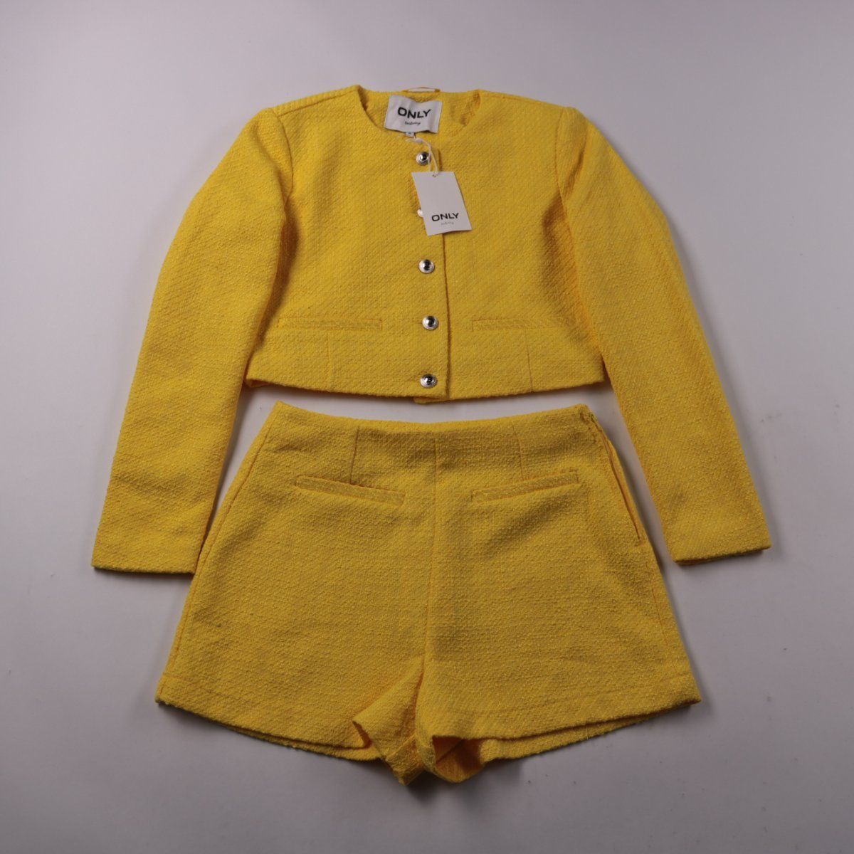 Женский костюм ONLY: укороченный жакет с длинным рукавом и шорты из фактурной ткани букле, цвет Lemon Zest. Подойдёт для летних и тёплых демисезонных образов в городе или на выход. Материал 100% полиэстер — лёгкий в уходе и быстро сохнет.
