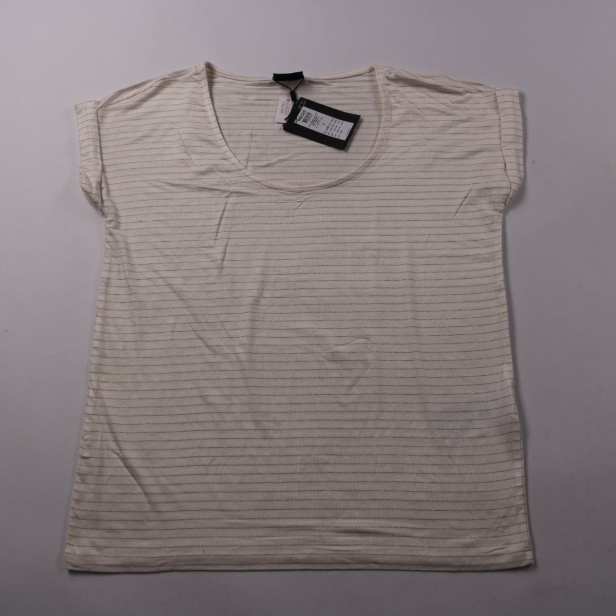 Футболка Pieces молочного цвета в тонкую серую полоску, с коротким рукавом и мягким трикотажем. Подойдёт для повседневных образов летом и как базовый слой под жакет или кардиган. Вискоза с добавлением эластана приятно тянется и комфортно садится по фигуре.