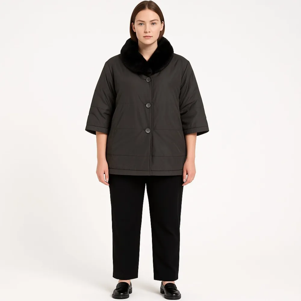 Женская куртка Mico с коротким рукавом и мягким меховым воротником, удобна для прохладной погоды и поездок. Лаконичный прямой крой и застёжка на пуговицы подойдут для повседневных образов. Практичный плюс — лёгкая в уходе полиэстеровая ткань и подкладка.