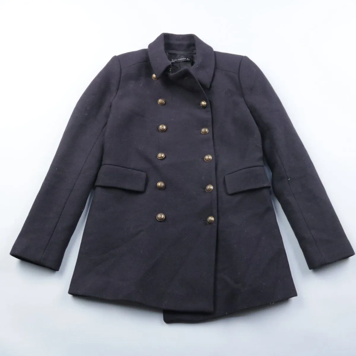 Женское пальто Zara Woman тёмно-синего цвета, двубортное, с металлическими пуговицами и отложным воротником. Подойдёт для прохладной весны и осени, хорошо смотрится в повседневных и более строгих образах. Есть удобные карманы с клапанами.