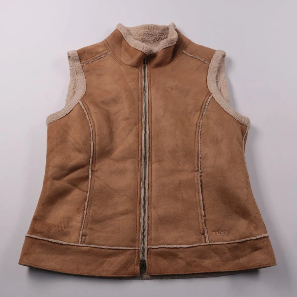 Женский жилет Per una из мягкого материала под замшу с тёплой подкладкой под овчину и застёжкой на молнию. Подойдёт для прохладной погоды и многослойных образов на каждый день. Практичный вариант: хорошо согревает, при этом не сковывает движения благодаря крою без рукавов.