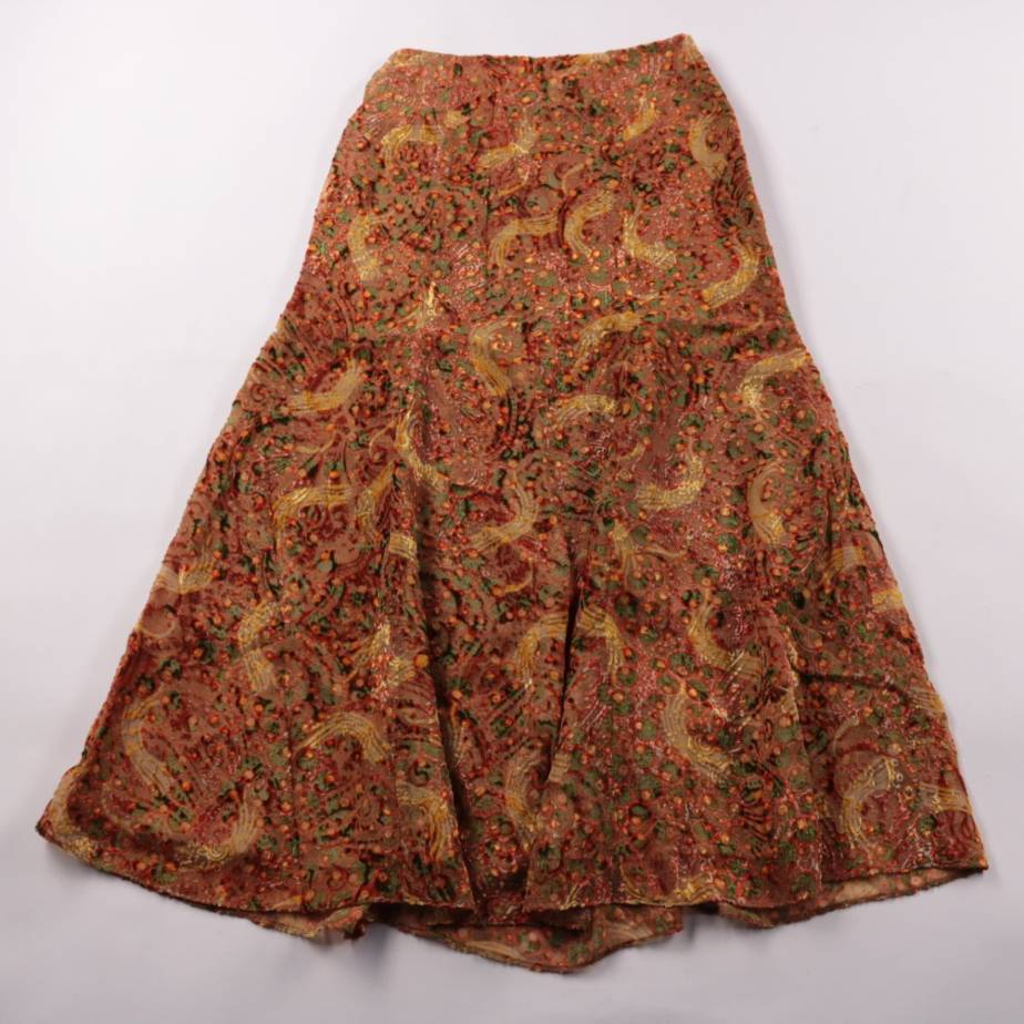 Женская юбка А-силуэта с жаккардовым/набивным узором пейсли в коричнево-золотистой гамме. Подойдёт для повседневных образов и офисных комплектов с однотонным верхом. Есть подкладка, поэтому юбка комфортнее в носке и лучше держит форму.